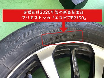 今回はタイヤ交換になります! 2020年製の新車装着タイヤがついてますね。 装着タイヤは「ECOPIA NH200C」になります。 それでは交換を始めていきます! 組替後は「ホイールバランス」を調整して車両へお取り付けします。 しっかりと仕上げを行い、お客様には立ち合いで「商品の確認」及び「ナット...