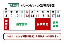 皆様こんにちは⸜(๑’ᵕ’๑)⸝ 世間はゴールデンウイークです。 お出かけ前のお車の安全点検・ タイヤ点検お待ちしております。 さて、5月の休業日のご案内です。 当店では、毎週水曜日を定休日とさせていただいておりますが、 5月14日(火)~16日(木)の期間中も 休業させていただきます。 ご不便をおかけ...