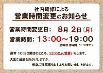 いつも当店をご利用いただきまして、誠にありがとうございます。 本日8月2日(月)は、社内研修のため営業時間が変わります。 営業時間 13:00~19:00 (作業受付 18:30まで) ご不便をおかけいたしますが、ご理解を賜りますようお願い申し上げます。 通常より短い営業時間ではございま...