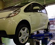 三菱 iのオイル交換を作業させていただきました。 エンジンは後ろに搭載されているのでテールゲートを開けて作業します。 矢印のところがドレンボルトで、○印がオイルフィルターになります。 今回はオイルフィルターも一緒に交換させていただきました。