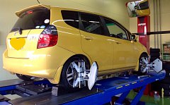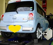HE22S型ラパンショコラのタイヤ交換を作業させていただきました 写真はタイヤ交換後にアライメント測定をしているところです こちらのモデルは専用14インチアルミホイールやライト、バンパー等が装着されたショコラというグレードで、テールゲートのチョコレートのエンブレムが可愛らしいですね タ...