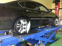 今日は、『ニッサン・フーガ』 のアライメントをご紹介(^.^) 当店では、ホイールにセンサーを付けアライメントを作業しています♫ タイヤの減り方が変だ!! 直進しているのに、ハンドルが斜めだ!! なんて場合は、アライメントがズレている可能性が…… そんな時はまずお店に!!