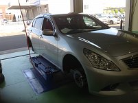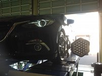 本日はパンクでお預かりしているアクセラのホイールアライメント作業をしています。 どんな感じで仕上げるか考え中の伊崎スタッフです。