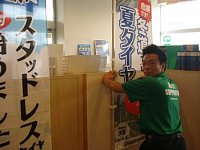 店内にスタッドレス展示準備中!! それに伴い全体的に店内改装中です 柴田チーフが店内にノボリを設置してくれています でも最初はノボリが逆になっていました(笑い) 急いで直しています 完成したらまたアップ致します