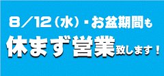 お盆休みに入った方もいらっしゃるようです! 帰省ラッシュによる渋滞の様子や長期休暇を海外で過ごすために出国される方などが、 ニュースで流れていますね。 これからお出かけ・帰省される方も多いのではないでしょうか? 当店は、毎週水曜日を定休日とさせて頂いていますが、 8月12日(水)は...