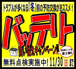 毎年恒例となりました『バッテリー買い替えキャンペーン』 タイヤ館GP新潟横越期間限定キャンペーンのご案内です!10月末まででしたが・・・例年同様好評だったため、味をしめて延長決定★だんだん朝晩の気温の変化が大きくなってきました!季節も進んできたので・・・ 当店お取り扱いのバッテリー...