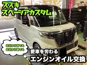 みなさん、こんにちは! いつも当店のホームページを ご覧頂き、ありがとうございます! 本日ご紹介の作業は 【スズキ スペーシアカスタム】 エンジンオイル交換です。 オイル交換の目安は5000km走行又は半年ごと どちらか早い方が交換時期になります。 お車のメンテナンスでは代表的なオイル交換!...