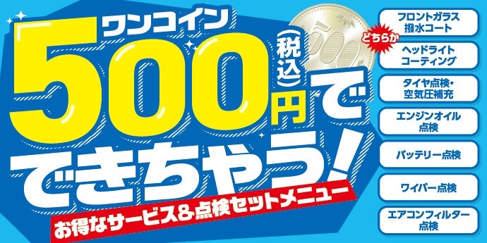 当店人気サービスの フロントガラス撥水とヘッドライトコーティングのどちらかと お車の点検がセットになった お得なワンコイン(500円税込)メニューが新登場! ヘッドライトの黄ばみを落とす ヘッドライトコーティングと 雨をはじくフロントガラスの 撥水コーティングと同時に お車のバッテリーやワ...
