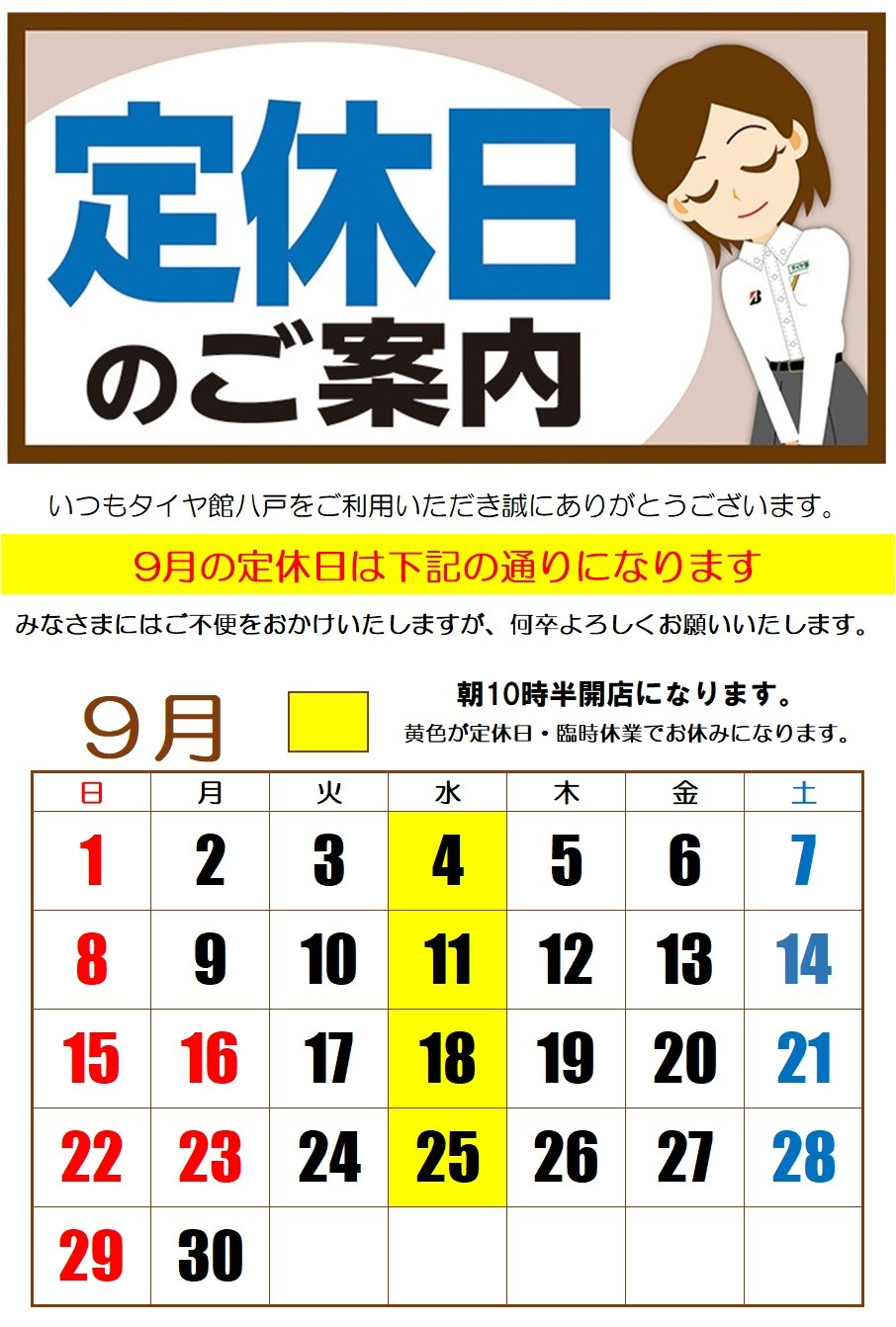 ▶9月の定休日のお知らせ 2024年8月30日 いつもタイヤ館八戸をご利用いただき 誠にありがとうございます(*^-^*)b 9月は通常通りの定休日となります。 お間違えの無いようご確認のほどよろしくお願い致します。 ▶▷ 9月定休日 ご不便をおかけしますが ご理解ご協力のほどよろしくお願いします。