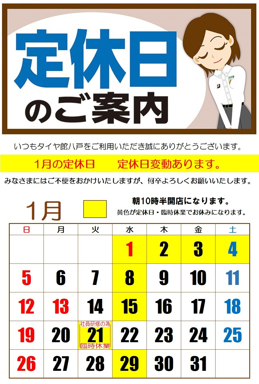 ▶ 【2025年】1月の定休日のお知らせ 2025年1月6日 いつもタイヤ館八戸をご利用いただき 誠にありがとうございます(*^-^*) 1月の定休日のおしらせ 8日・15日・29日の水曜日と 社内研修の為 21日火曜日を臨時休業 22日水曜日を振替営業 とさせていただきます。 お間違えの無いようお願い よろしく申し上げます。 2025年もタイヤ館八戸を よろしくお願いいたします(*^-^*)!