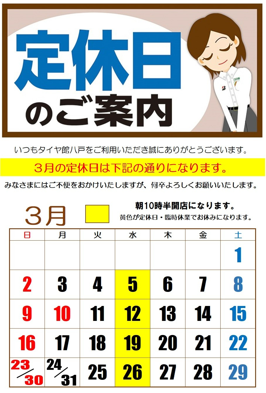▶ 3月の定休日のお知らせ