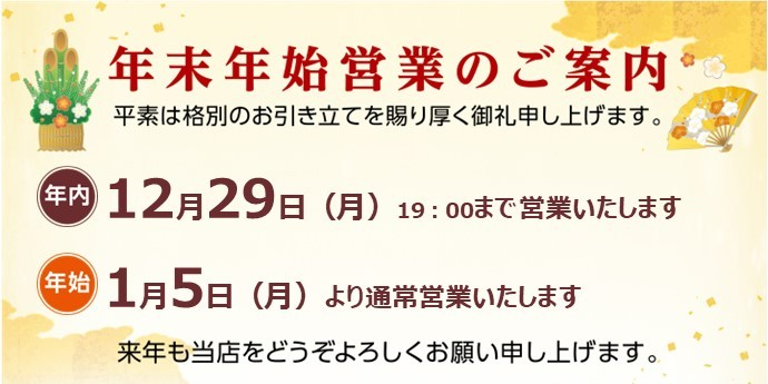 年末年始案内 2025年12月29日 本年も当店を御愛顧を賜り厚く御礼申し上げます 2025年12月30日より2026年1月4日まで年末年始休業と させて頂きます ご迷惑をおかけいたしますが、何卒ご了承くださいますよう お願い申し上げます