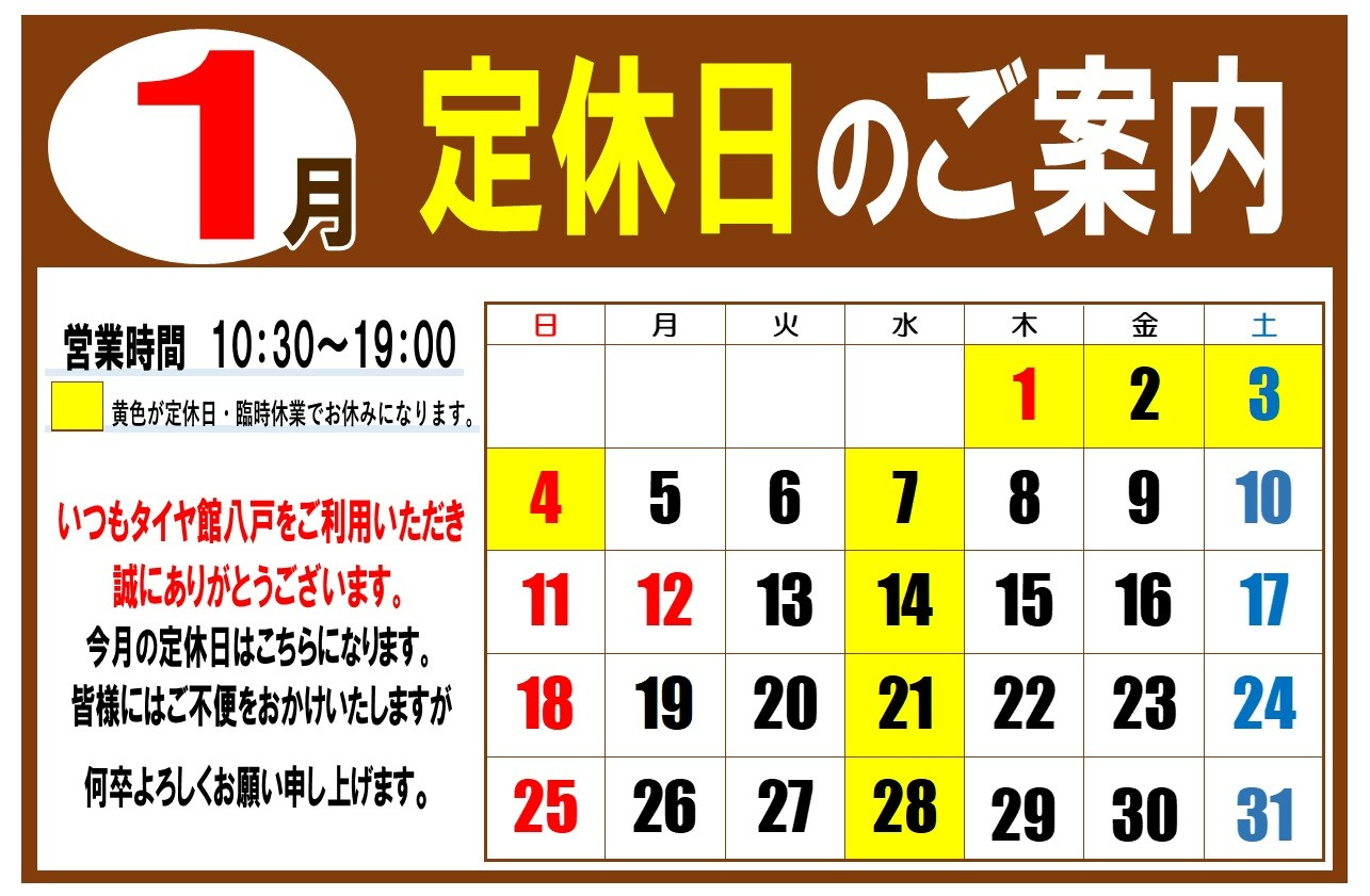 ▶ 1月の定休日のお知らせ 2026年1月8日 いつもタイヤ館八戸をご利用いただき 誠にありがとうございます(*^-^*) 1月の定休日のおしらせ 【 10:30オープン 】 【 定休日 毎週水曜日 7日・14日・21日・28日 】 【 年始は~1月4日までお休みです 】 間違えの無いようお願い申し上げます。 皆様のご来店お待ちしております(^^)/
