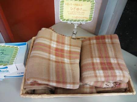 ひざ掛け準備いたしました。お待ちの間お使いください。
