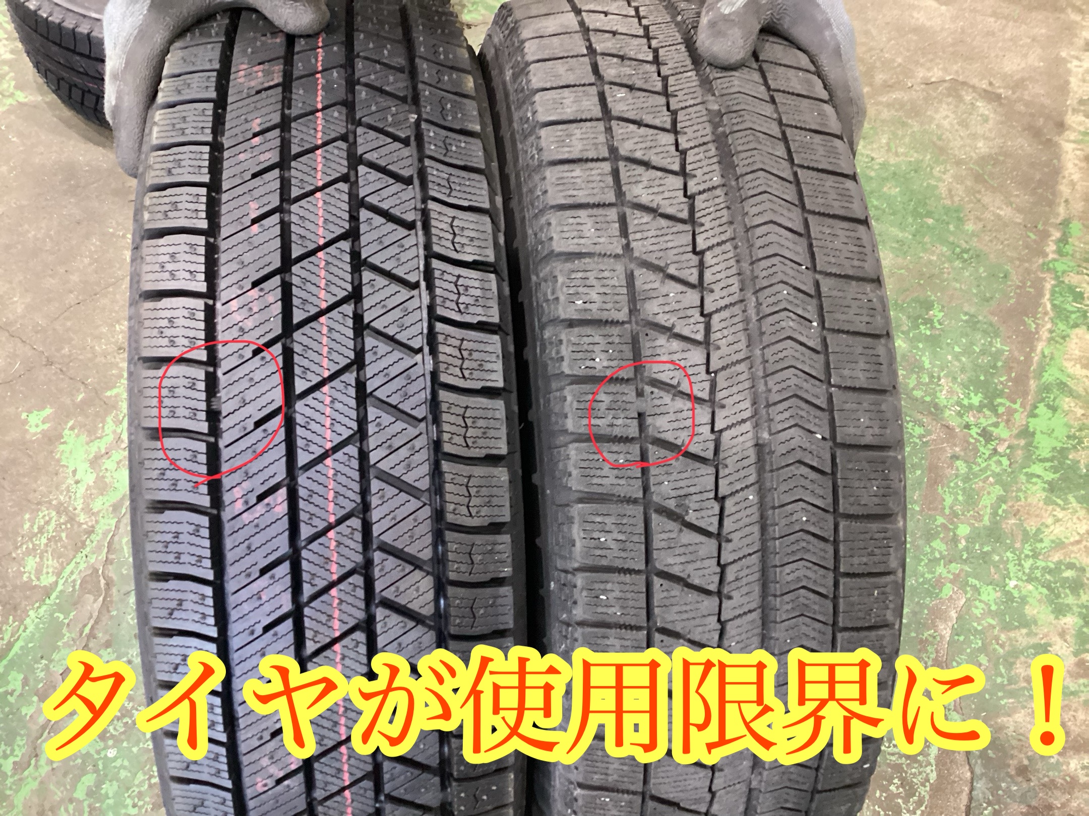 下の写真は新品タイヤと使用限界まで使用したタイヤの比較写真です。