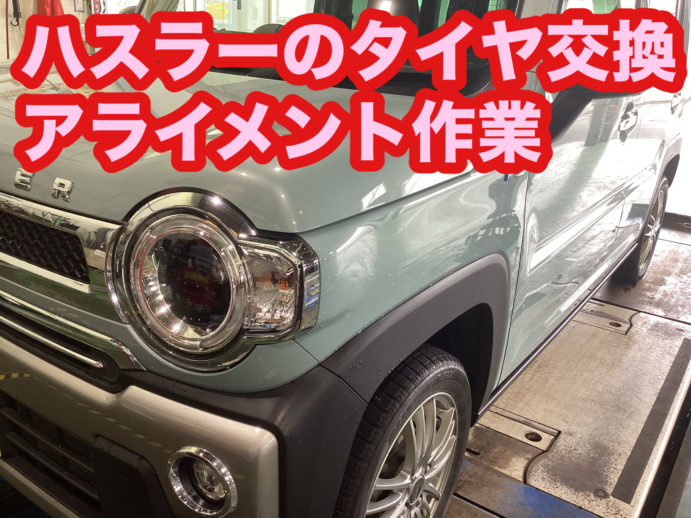 今日はスズキ、ハスラーのタイヤ交換アライメント調整作業です