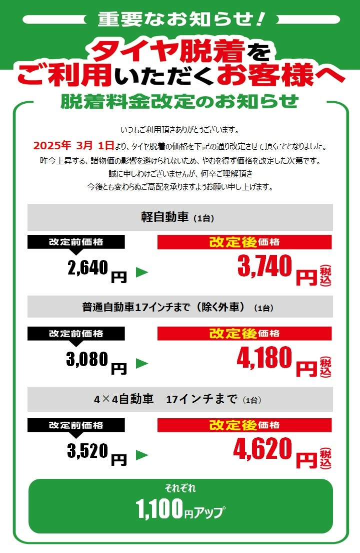 タイヤ脱着・クロークの値段が改定いたしました。