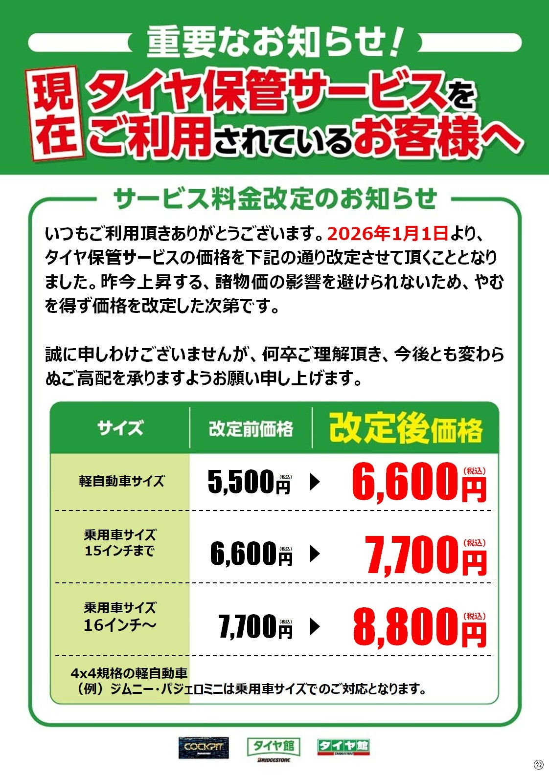 【タイヤクロークご利用のお客様へ】クローク料金値上がりについて