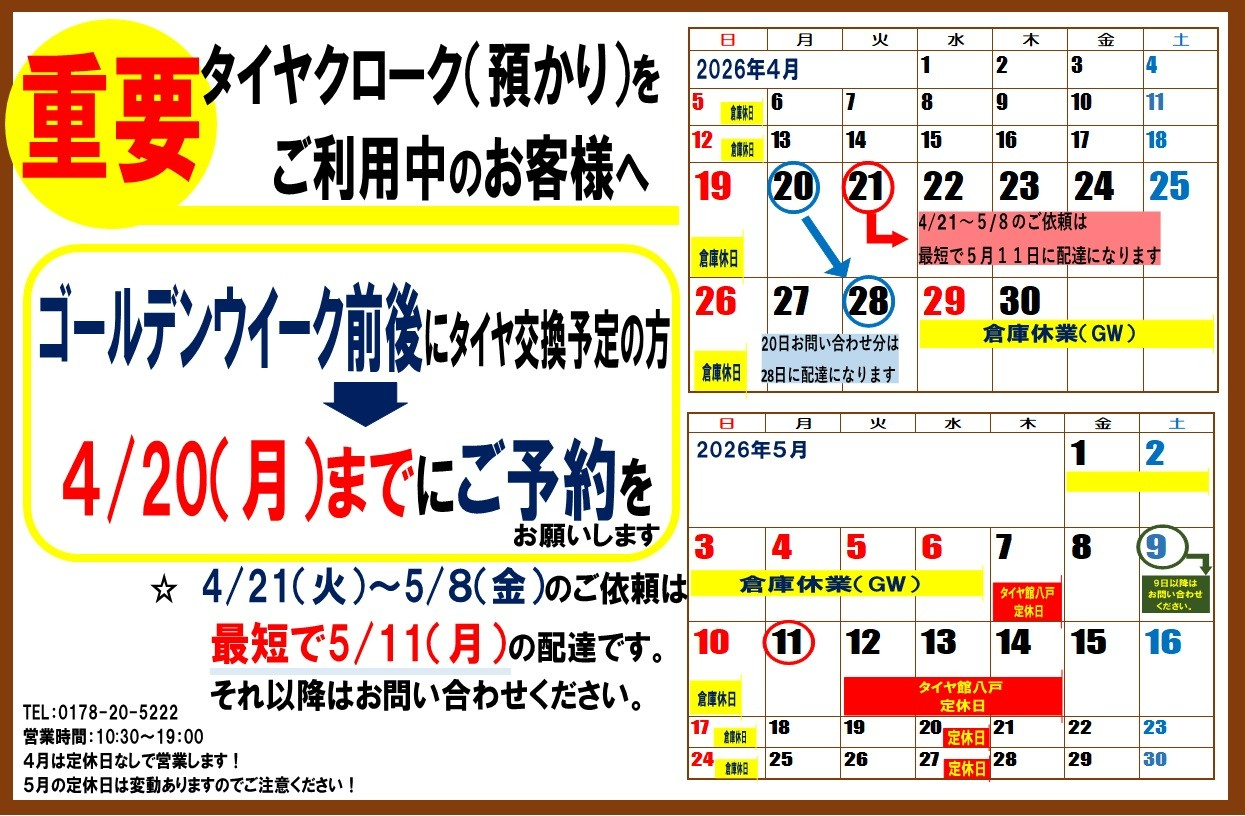 ゴールデンウイーク前後にタイヤ交換予定の方は