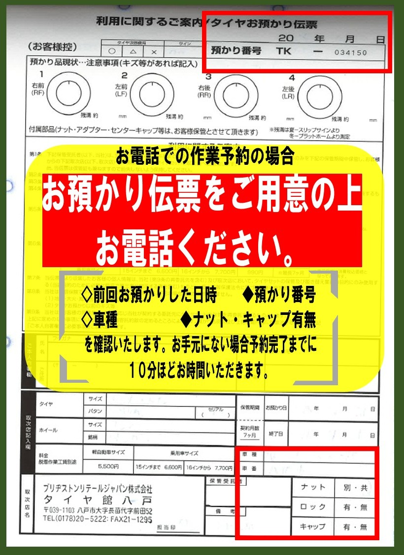 タイヤ預かり時に渡している、預かり伝票をお手元に