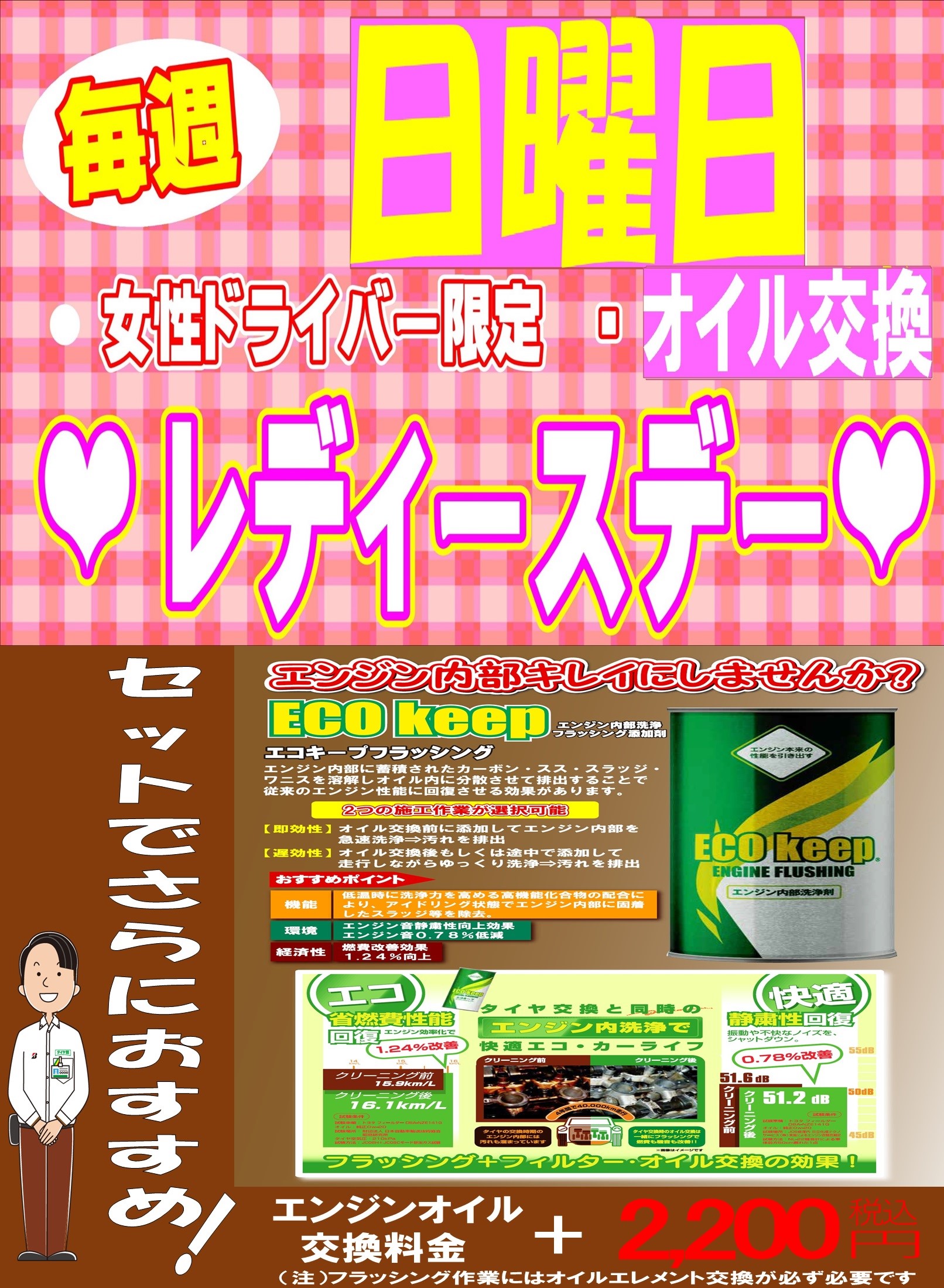 日曜といえばレディースday オイル交換が通常価格より50%OFF!!