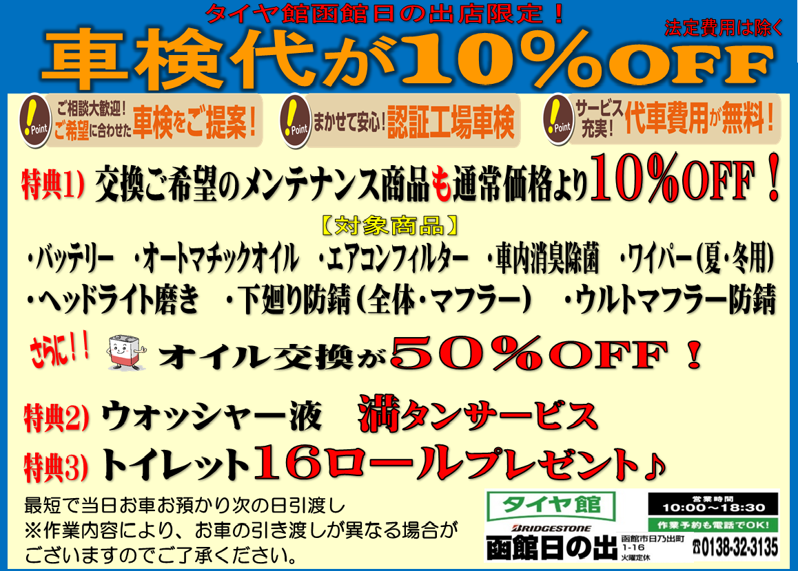 注)上記特典付き各割引サービスはタイヤ館日の出店の企画となっております。