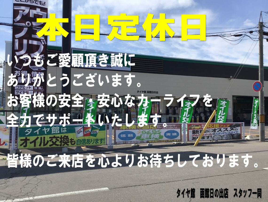 タイヤ館函館日の出店は本日定休日(毎週火曜日)です。
