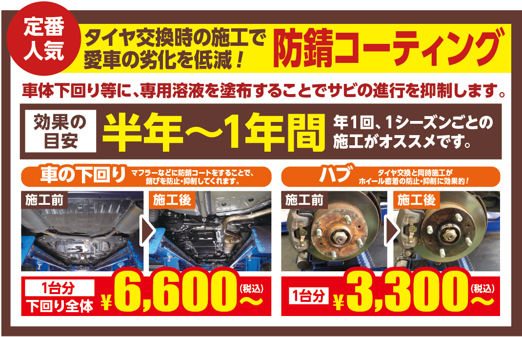 施工のタイミングとして季節毎のタイヤ交換時や新品タイヤ交換時