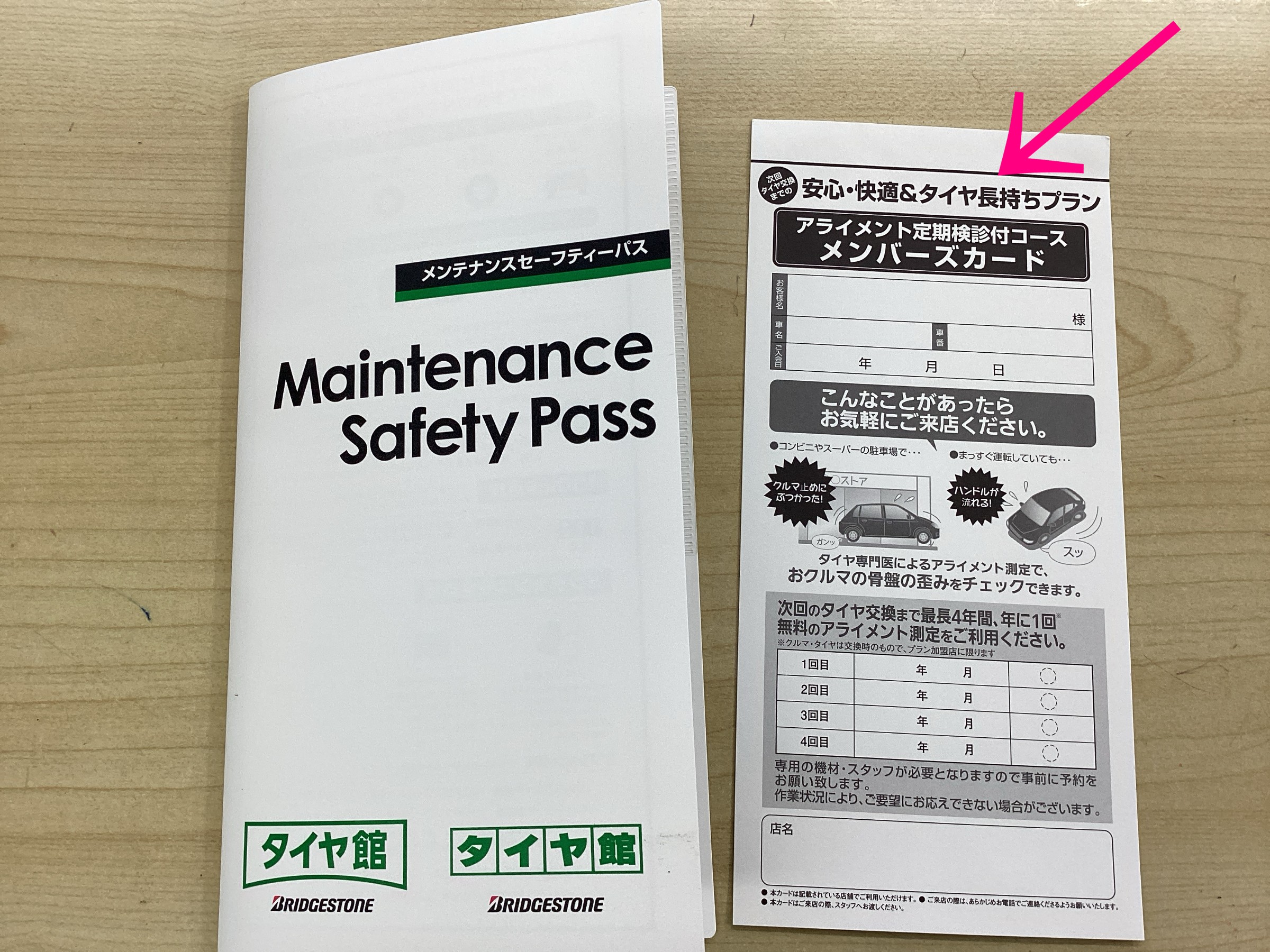 タイヤ館の下記 ↓ ↓ セーフティーパスの中に【無料アライメント定期健診】カードの