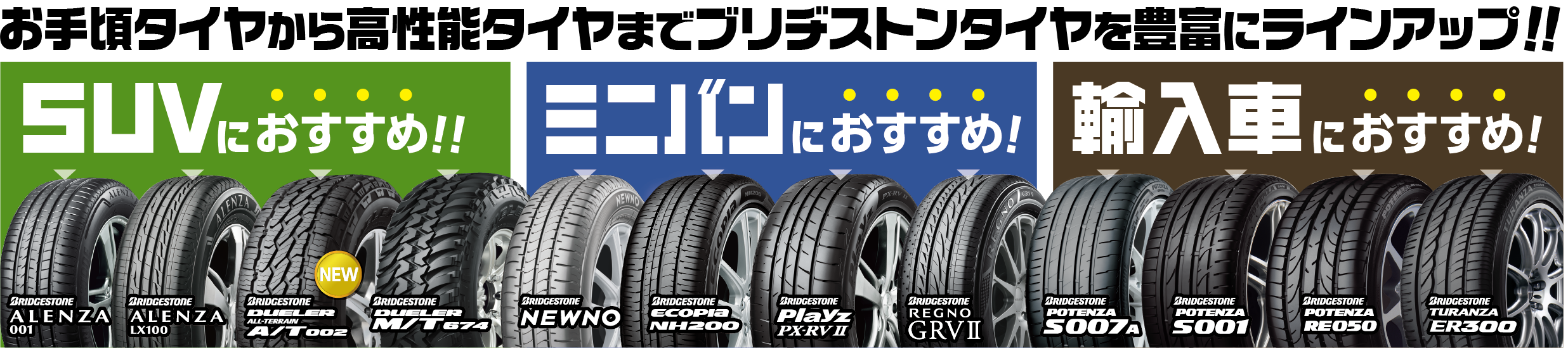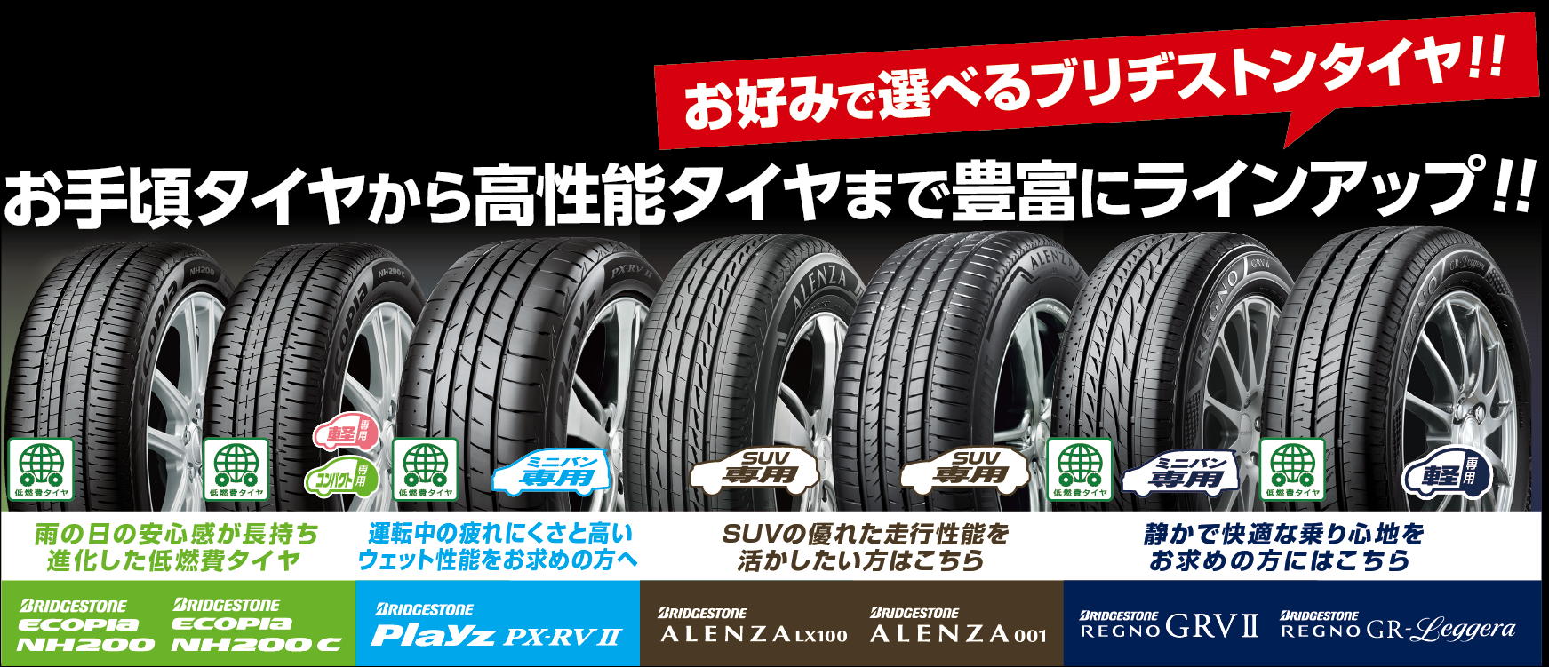 当店では、ブリヂストン製のお手頃タイヤから高性能タイヤまで豊富にラインナップ!