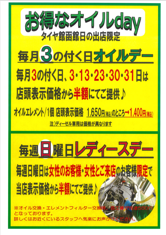 お得なオイルデイとレディースデイのお知らせです∩^ω^∩
