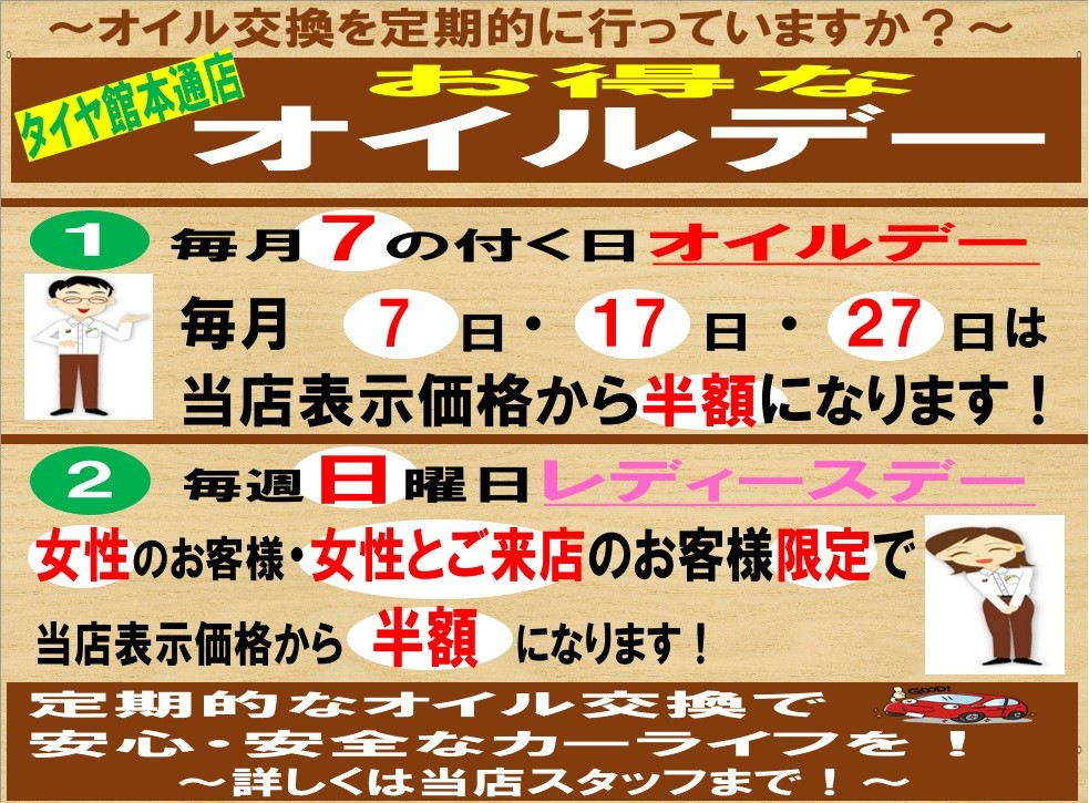 毎月7の付く日はオイルデー/毎週日曜日はレディースデー!!