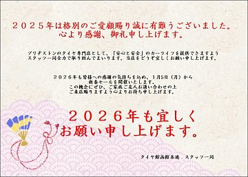 2025年、本日営業最終日! タイヤ館本通店、ご利用ご愛顧頂き、誠に有難うございます。 皆々様には、感謝・感謝でいっぱいです。 2026年もタイヤ館本通店をご愛顧頂けるよう、精進していきたいと思いますので 引き続き宜しくお願い申し上げます。 2026年も皆様にとって良い年で有ります様、心より願...