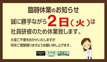 みなさん、こんにちは! いつもタイヤ館本通店、ご利用頂き誠にありがとうございます\(^o^)/ 12月 2025年もあと1ヶ月となりましたね・・・・ ~臨時休業のお知らせ~ 誠に勝手ながら本日は、社員研修の為、休業とさせて頂きます。 ご迷惑お掛け致しますが、何卒宜ご理解の程 宜しくお願いいたしま...