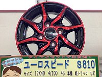 こんな派手な展示品は久しぶりではないでしょうか 「ユーロスピードS810」(ブラックポリッシュ+レッドクリア) 12インチということでメインは軽バンです 色合いを合わせるのは難しいかもしれませんが この奇抜さは履いたら目立つこと間違いなしの商品です ドレスアップとしていかがでしょうか? ...