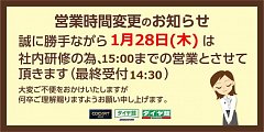 トップページ「お知らせ」に掲載させて頂いていますが重ねてご案内させて頂きます 本日28日(木)は社員研修の為、15時までの営業となります 大変ご不便をお掛けしますがご理解賜わりますようお願い申し上げます
