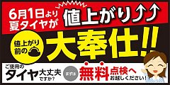 夏タイヤ値上がりは明日6月1日からとなります! 今期夏タイヤご購入をご検討のお客様はお急ぎ下さい!