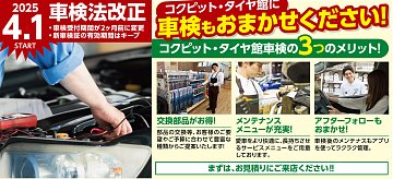 いつも当店をご利用頂きありがとうございます。 今回は、「車検」をよりお得にお受けいただくために、 コクピット/タイヤ館がオススメする「車検前点検」についてご紹介いたします。 【車検前点検は、出費を集中させない、かしこい車検の受け方】 ・車検って何?車検って良く分からない! ・はじめ...