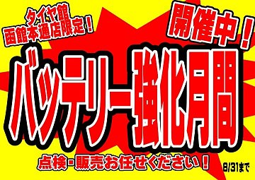 みなさん、こんにちは! いつもタイヤ館本通店、ご利用頂き誠にありがとうございます\(^o^)/ 8月は何かとお出かけする機会が増える時期。 お盆・夏休みで遠出する予定など・・・・ そこで! 当店では、【バッテリー強化月間】実施しています!! 夏の暑さでエアコン フル活用していますよね? この...
