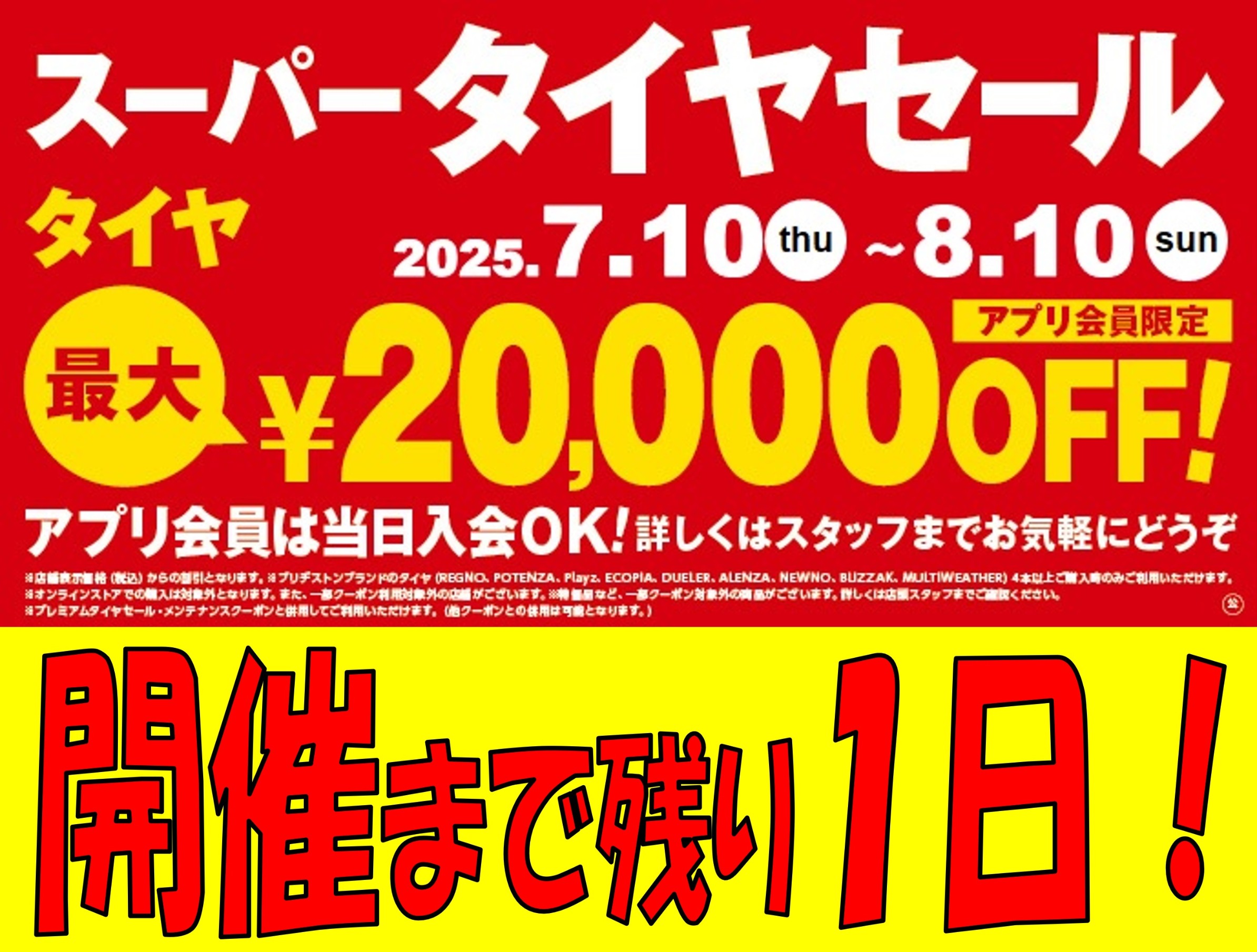 皆様、こんにちは! いつも当店とご利用いただきありがとうございます! 告知!! 7/10(木)~8/10(日)まで「スーパータイヤセール」開催致します! タイヤ交換を検討されているお客様! 当店スタッフが今お使いのタイヤを基準に、お客様の使い方・ご予算に合った 最適なタイヤをご提案さ...