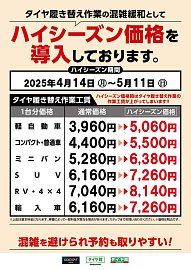 みなさん、こんにちは! いつもタイヤ館本通店、HPご覧頂き誠にありがとうございます\(^o^)/ この春から、タイヤ交換作業ハイシーズン価格を導入しています。 タイヤ交換の時期となりましたが、価格も抑えられるメンテナンスパックがオススメです! メンテナンスパックは値上がりありません!いつ...