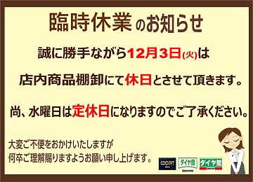 ☆臨時休業のお知らせです☆