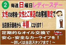 【開催予告】明日5日日曜日はレディースデー!オイル交換が店頭表示価格から半額!