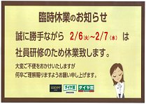 いつも当サイトをご覧頂き誠にありがとうございます 誠に勝手ながら2/6(火)・2/7(水)は 社員研修の為、休業致します 2/8(木)より通常通り営業となります 大変ご不便をおかけいたしますが 何卒ご理解賜りますようお願い申し上げます