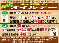 「開催予告」毎月7の付く日はオイルデー/毎週日曜日はレディースデー!!