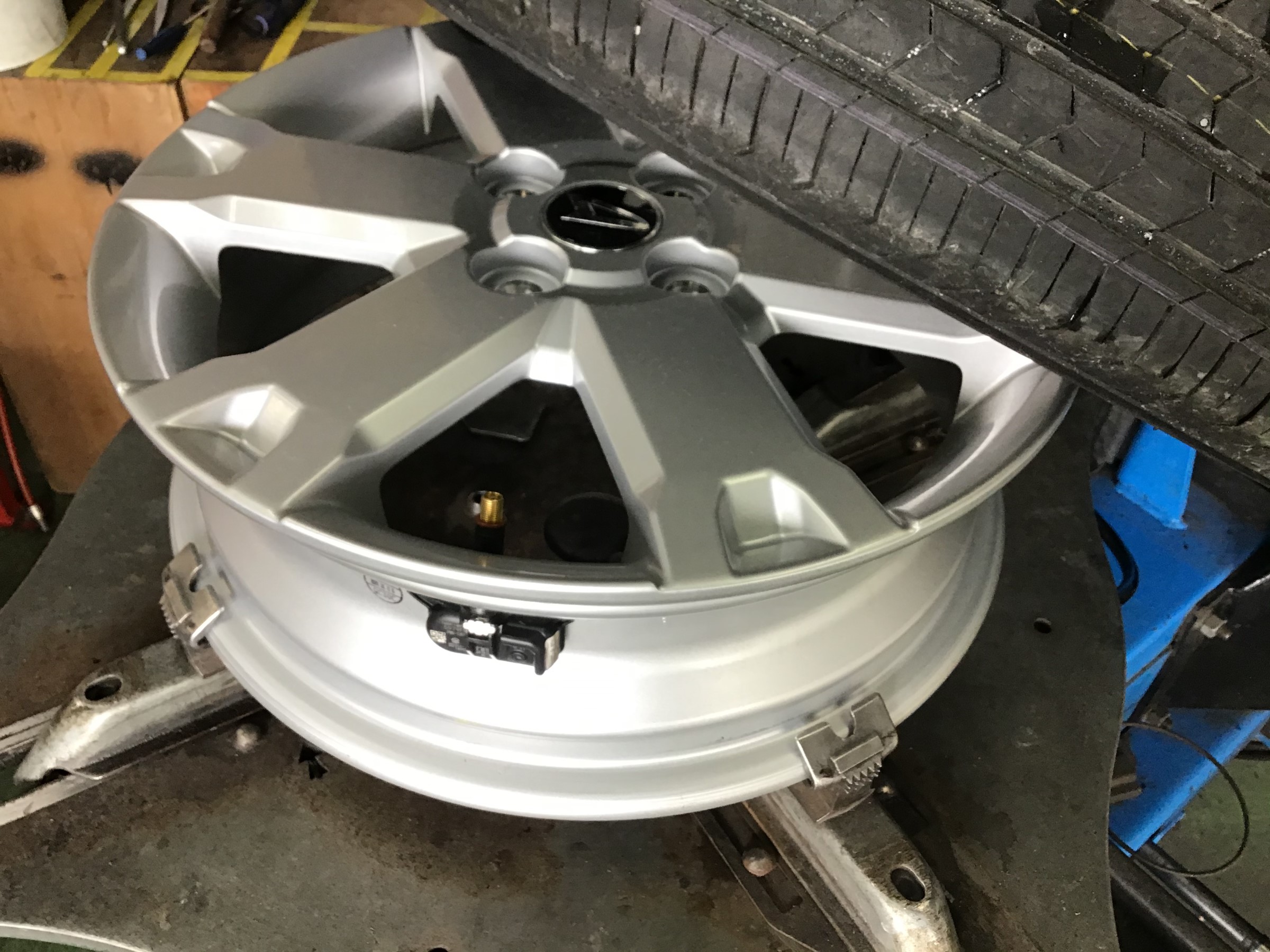 タイヤをバラシて、ホイールにセンサーを取付です。