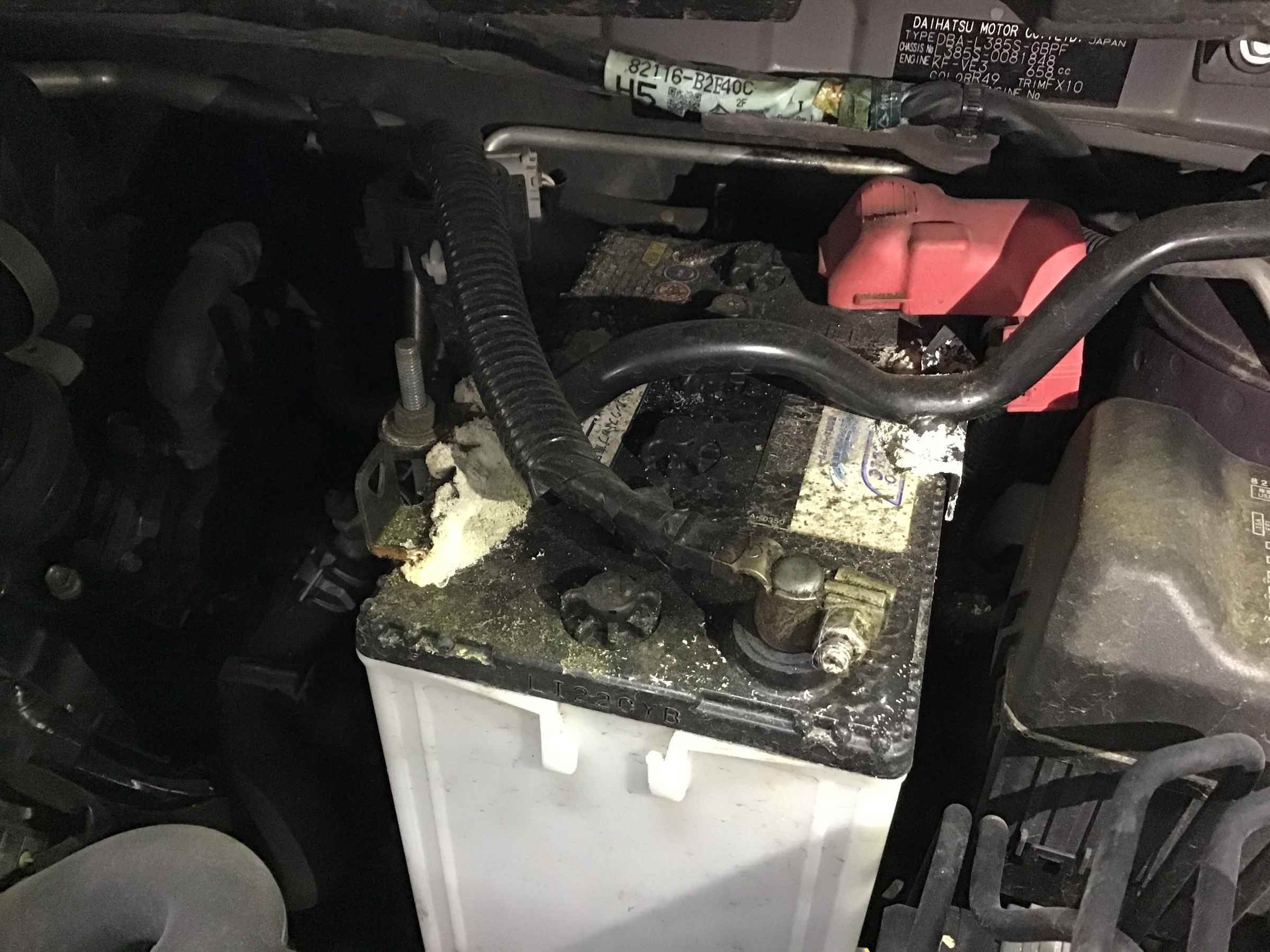 これはバッテリー端子の根元から液(希硫酸)が漏れ出し再結晶化した硫酸鉛。