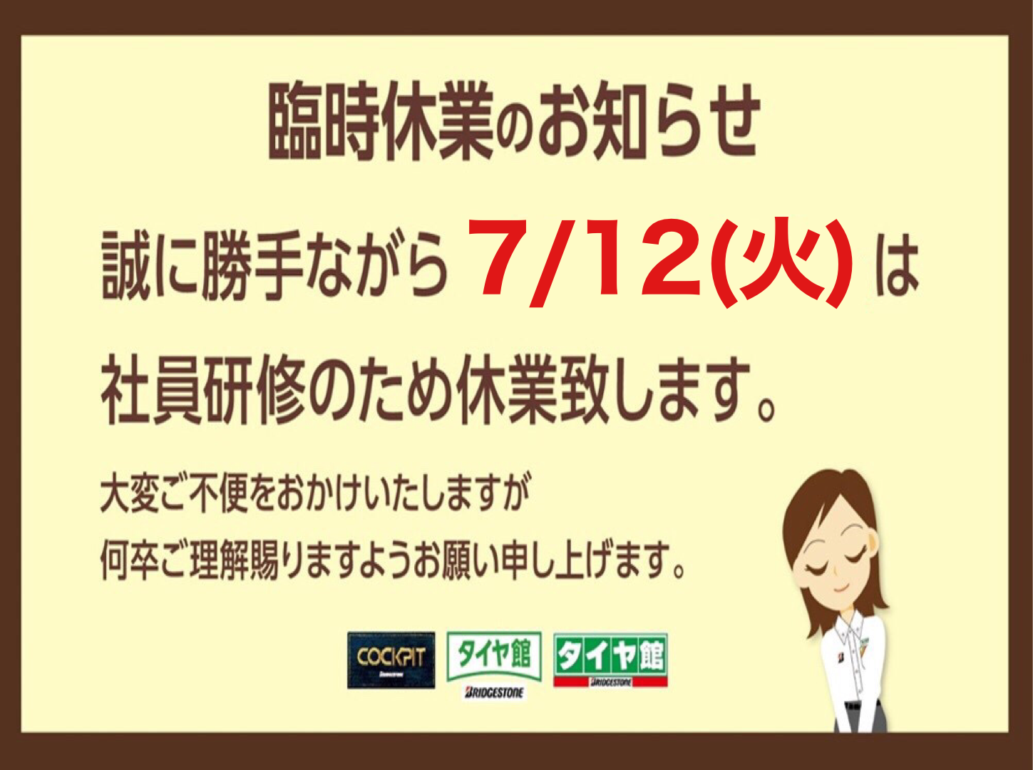 タイヤ館をご利用の際は7月14日(木)からのお越しをお待ちしております。