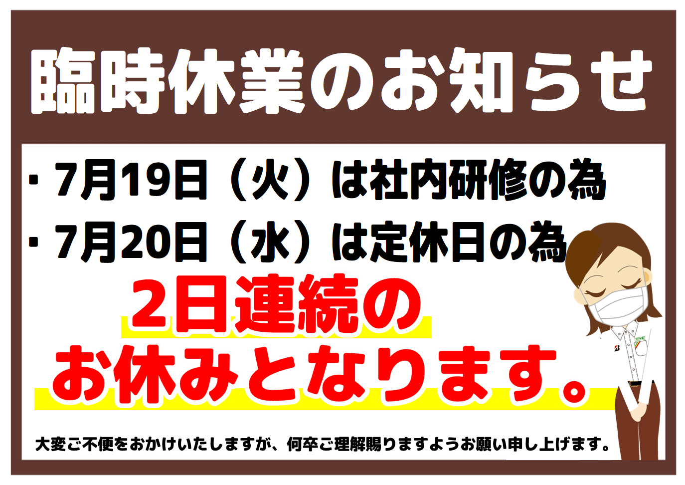 本日7/19(火)&明日7/20(水)は休業日となっております。