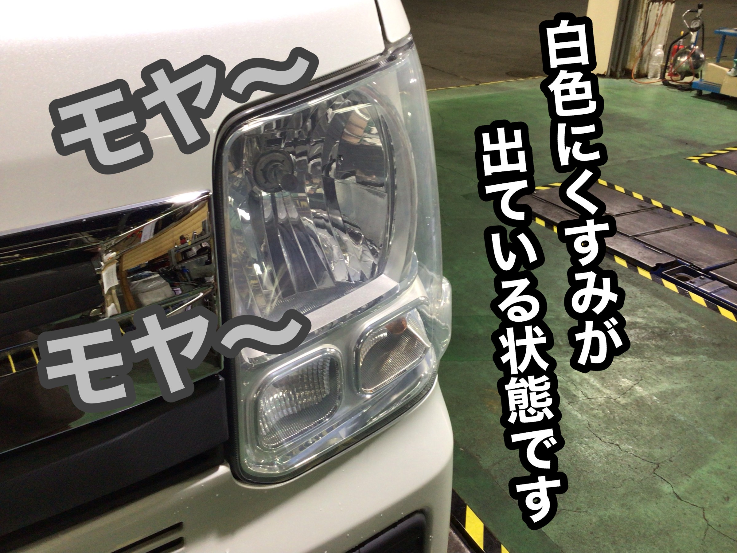 まずは作業をする前の状態です。白く、モヤ~っとくすんでいる状態ですね。